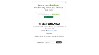 ShitFilter.News is an AI-driven news aggregator that filters and explains top news stories. The platform provides a list of news articles with brief summaries, carefully selected and analyzed by AI algorithms. With a focus on a wide range of topics like financial and ethical conduct, wealth inequality, technology in sports, and more, ShitFilter.News offers insights into the incentives of participants and potential outcomes. It aims to deliver news objectively, enabling readers to form their own opinions without bias from journalists or media outlets. The platform's comprehensive analysis, unbiased perspective, and detailed article summaries make it an essential tool for staying informed about current events.